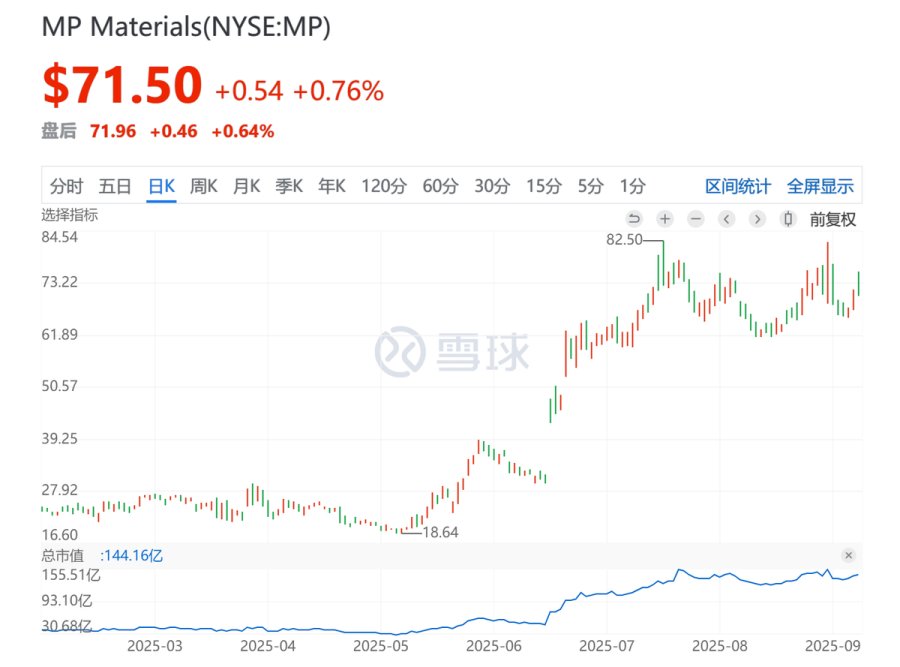 一个极具参考价值的例子是美国的稀土公司MP Materials。随着稀土逐渐成为科技博弈的关键战略资源,MP Materials因其作为美国本土稀土开发“救命稻草”的独特定位,市值大幅上涨,并反过来引发了市场对中国稀土龙头公司估值的全面提升。