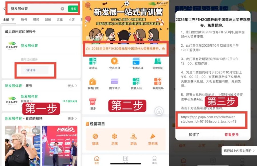 市民群众可通过关注新发展体育公众号,点击下方“一键订场”,并点击进入2025年世界F1H2O摩托艇中国郑州大奖赛“观赛券”链接,即可完成免费预约!(详情见下图)