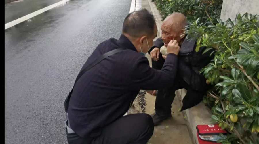 他立即调头,迅速来到现场,小心翼翼的将老人从绿化带内搀扶起来,然后让其坐下休息。冯海河发现老人面部和手部均有擦伤,随身没有携带有效证件,也无法说清其家庭住址和家人联系方式。