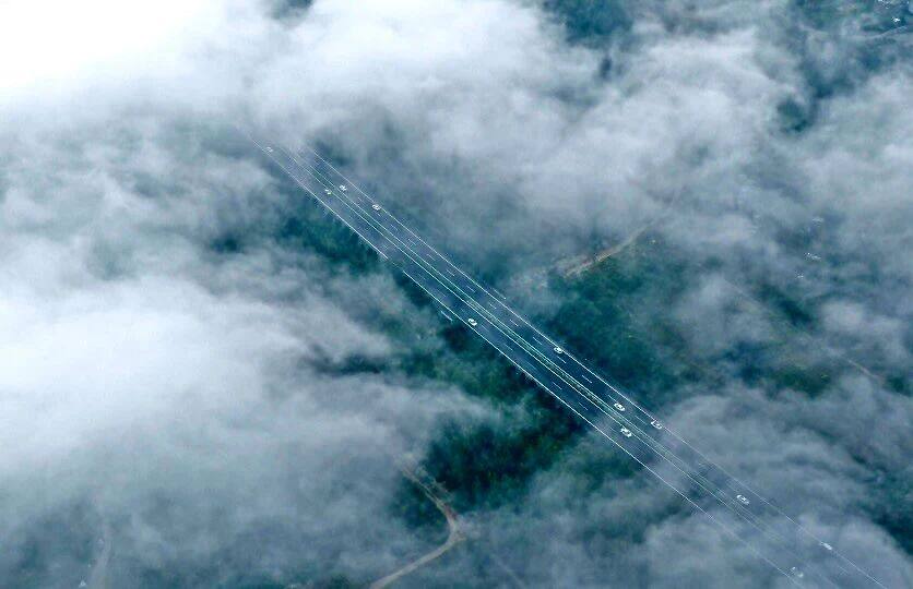 山风掠过,云浪翻卷:有时泄出几丛被雨洗得发亮的绿树,有时又让褐黄色的山岩在云隙间“闪个面”,活像大自然把青山裁进了云的软绸。