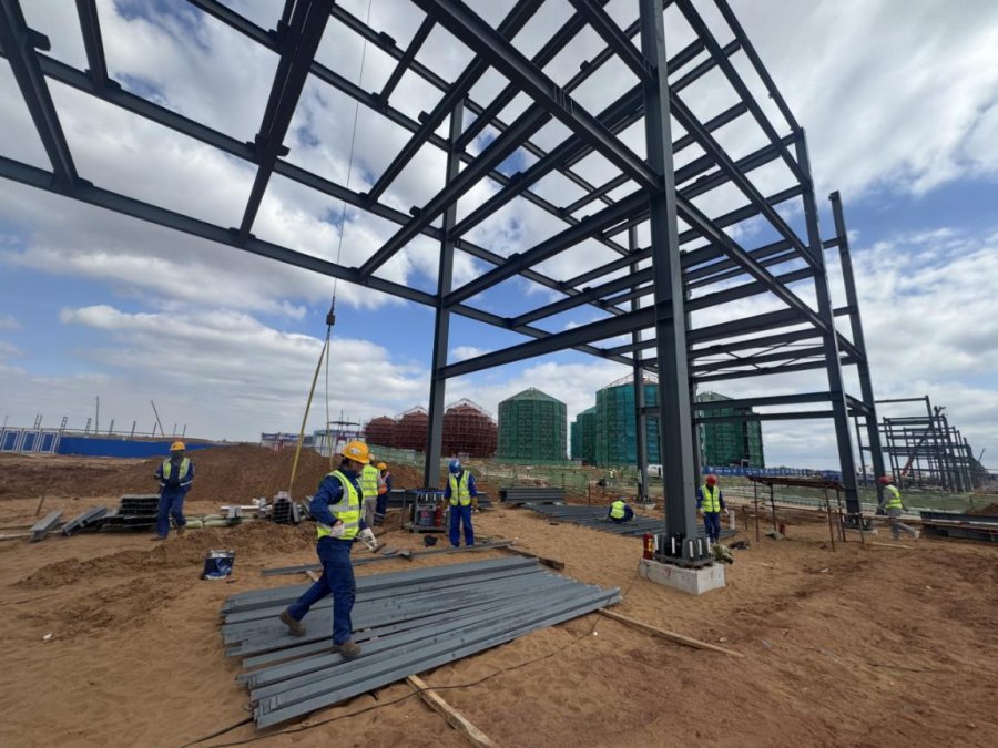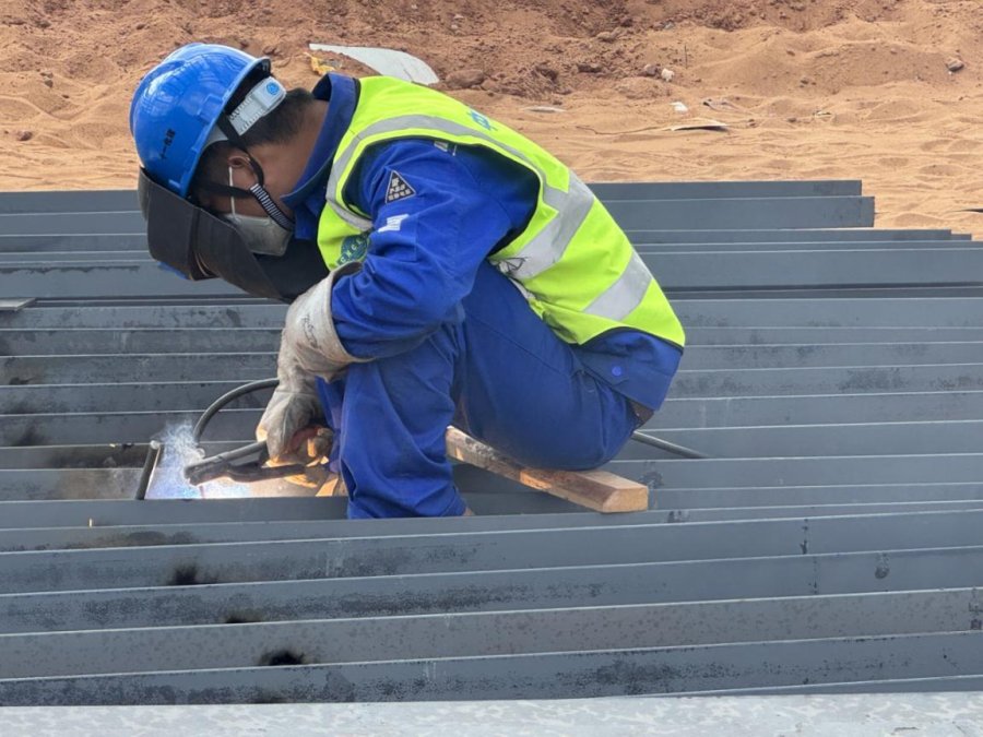 夜幕降临,施工现场灯火通明。党员干部既当指挥员,又当战斗员,穿梭于各个作业面之间,紧盯施工进度,组织现场协调,及时解决各类问题,确保各环节衔接顺畅、高效推进。汗水浸湿工装,疲惫掩不住坚毅。为确保当日吊装任务顺利完成,他们加班加点组拼钢结构;在四溅的焊花映照下,工人们展现出“特别能吃苦、特别能战斗”的顽强作风。正是这种不畏艰难、敢于担当的精神,推动着项目建设稳步向前。