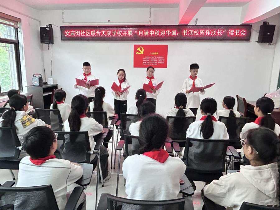 9月26日,文庙街社区与天成学校携手举办“月满中秋迎华诞,书润社区伴成长”主题读书会。30余名师生齐聚社区文化活动室,孩子们以稚嫩却坚定的嗓音朗诵红色经典,在朗朗书声中重温革命记忆,诉说对祖国母亲的祝福,让文化的温度与家国的情怀在阅读中悄然传递。
