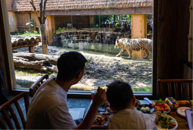 在酋长之家和草原探险基地,依托专业设计的游览动线和科普讲解,游客可乘坐特制车辆与动物亲密互动。来自北京的李女士分享道:“白虎趴在车顶,仅隔着一扇车窗,投喂时超级刺激,还看到了会站起来转圈索要苹果的大棕熊,这种近距离接触动物的体验非常特别。”