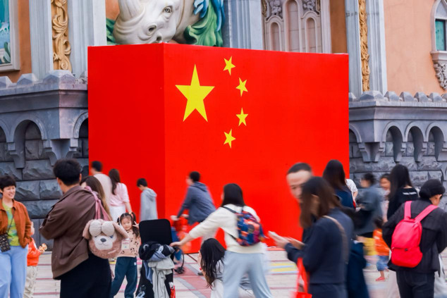 当成千上万的游客手持免费赠送的小红旗走入园区,节日氛围瞬间点燃。银基动物王国的国庆版花车巡游、夜间星光巡游在烟雨中照常进行,演员们热情不减地与游客互动。动物百老汇剧场每日加演至四场,特别设置的“千人合唱红歌”环节引发全场共鸣。“虽然大家素不相识,但全场一起挥舞红旗参与大合唱,那种情不自禁的感动,让人觉得不虚此行。”一位河北游客动情地说。