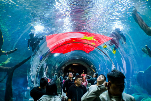 “水下红旗秀”更是国庆演艺期间的亮点。多名潜水员在湛蓝的池水中舞动或巡展巨幅国旗,通过独特而鲜活的形式为祖国庆生,这种难以言喻的美和力量感正是“中国式浪漫”的具象化显现,每一次演出都会吸引无数游客拍照,成为社交媒体上广泛传播的精彩瞬间。