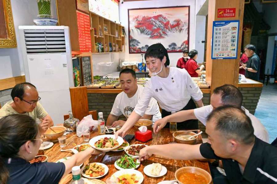 如果说刀削面是登封本地美食的代表,那么豫丰汇河南名菜楼则承载着更多河南美食的“集体记忆”。作为主打河南传统名菜的餐饮企业,双节期间,这里成为不少家庭聚餐、游客尝鲜的首选之地。“我们推出了‘河南风味套餐’,把鲤鱼焙面、道口烧鸡、开封灌汤包这些经典豫菜整合在一起,方便游客一次性品尝到河南各地的特色。”豫丰汇河南名菜楼相关负责人介绍,为了保证菜品品质,店里的厨师团队提前研究游客口味偏好,在保留传统做法的基础上,适当调整了菜品的咸淡程度,同时增加了菜品的出餐效率。