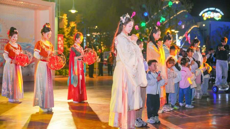 全新的国风人鱼演出《山海洛神赋》、气势恢宏的山海异兽大巡游、传承千年古韵的月满金秋风华颂,还有融合了非遗打铁花和神话“燧人取火”的璀璨星海花火秀等海洋国潮盛宴,引得游客阵阵欢呼。中原第二只帝企鹅宝宝的公开亮相,更为假期增添了温暖与惊喜。