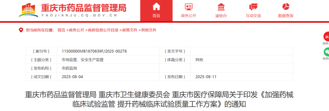 8月11日,重庆市药品监督管理局、重庆市卫生健康委员会、重庆市医疗保障局三部门印发《加强药械临床实验监管 提升药械临床试验质量工作方案》,方案中提到要加强日常监管,对于新备案的药物临床试验机构或者增加临床试验专业、地址变更的,新备案的医疗器械临床试验机构,于60个工作日内开展首次监督检查,重点核实机构和/或专业的备案条件;坚持高标准引领,拓展国际视野,鼓励引导机构运用国际通行标准和规则,建立完善相关行业标准、专家共识、工作指南,推动人工智能等新技术在受试者招募等方面的运用,提升转化效率;提升临床试验效率,鼓励机构优化工作制度及流程,将临床试验项目启动整体用时压缩至12周以内。(来源:重庆市药品监督管理局)