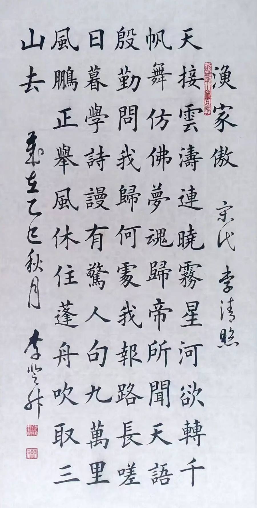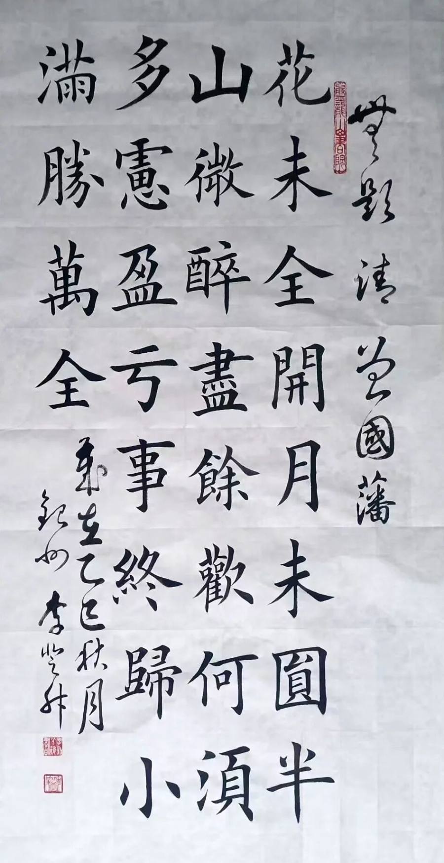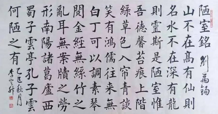 不见浮滑态势和轻浮之气,是李登升先生笔下楷书的基本修成,其楷书正如其人一般,是谓高雅高古双兼也!众幅楷书所行,亦是不求于夸张亮眼,而是但求与稳中带正,古中带典,笔法所行,一撇一捺优雅精湛,一横一竖韵味守正,而平常书家若是想在楷书中达到这一境界,就必须要身怀于一种与世无争的文人气魄和雅俗共赏的品质魅力,除此以外,皆匠气耳!因此单从这一点上来说,李登升先生的翰墨造诣就已然是有超于众人也!笔致深厚,抱朴守真,物我两忘,正气浩然!