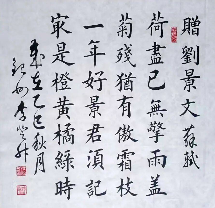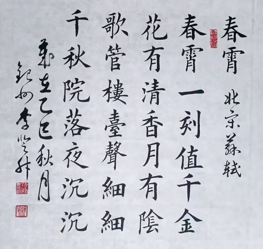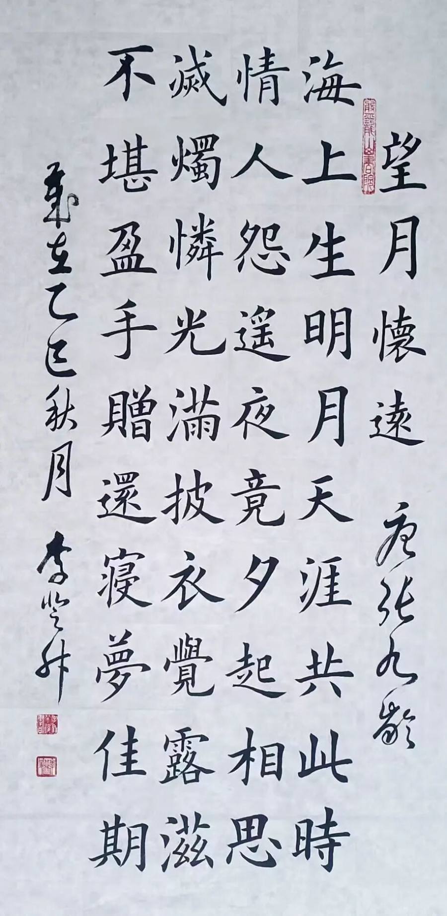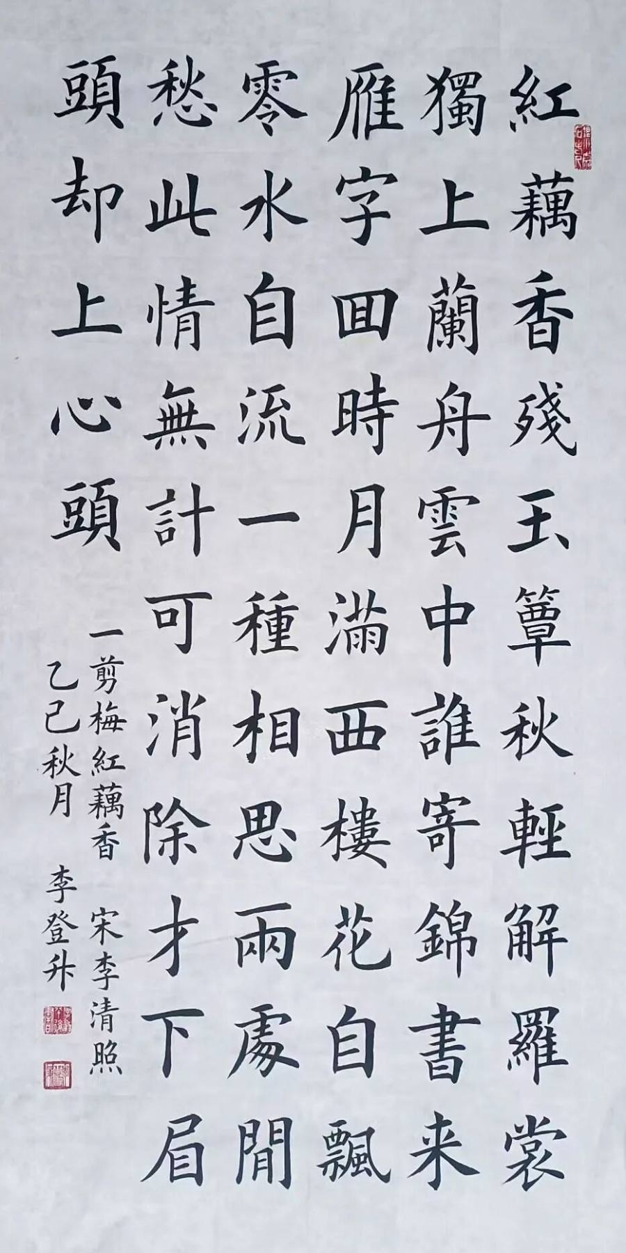 不见浮滑态势和轻浮之气,是李登升先生笔下楷书的基本修成,其楷书正如其人一般,是谓高雅高古双兼也!众幅楷书所行,亦是不求于夸张亮眼,而是但求与稳中带正,古中带典,笔法所行,一撇一捺优雅精湛,一横一竖韵味守正,而平常书家若是想在楷书中达到这一境界,就必须要身怀于一种与世无争的文人气魄和雅俗共赏的品质魅力,除此以外,皆匠气耳!因此单从这一点上来说,李登升先生的翰墨造诣就已然是有超于众人也!笔致深厚,抱朴守真,物我两忘,正气浩然!