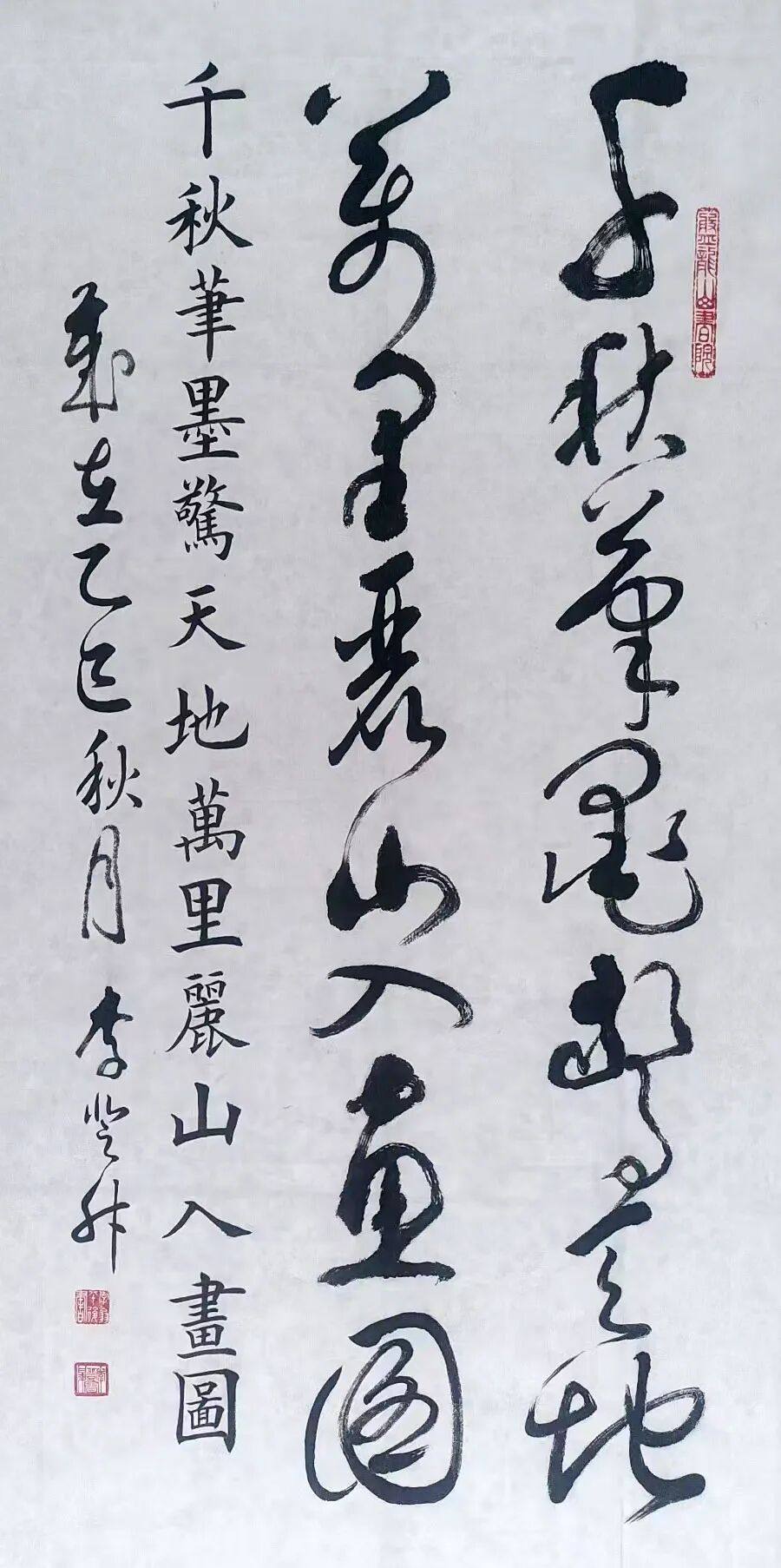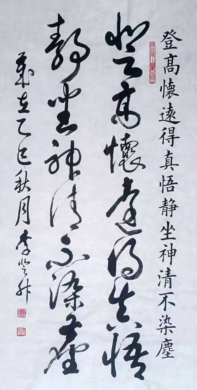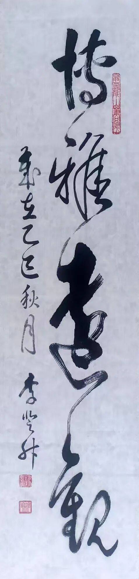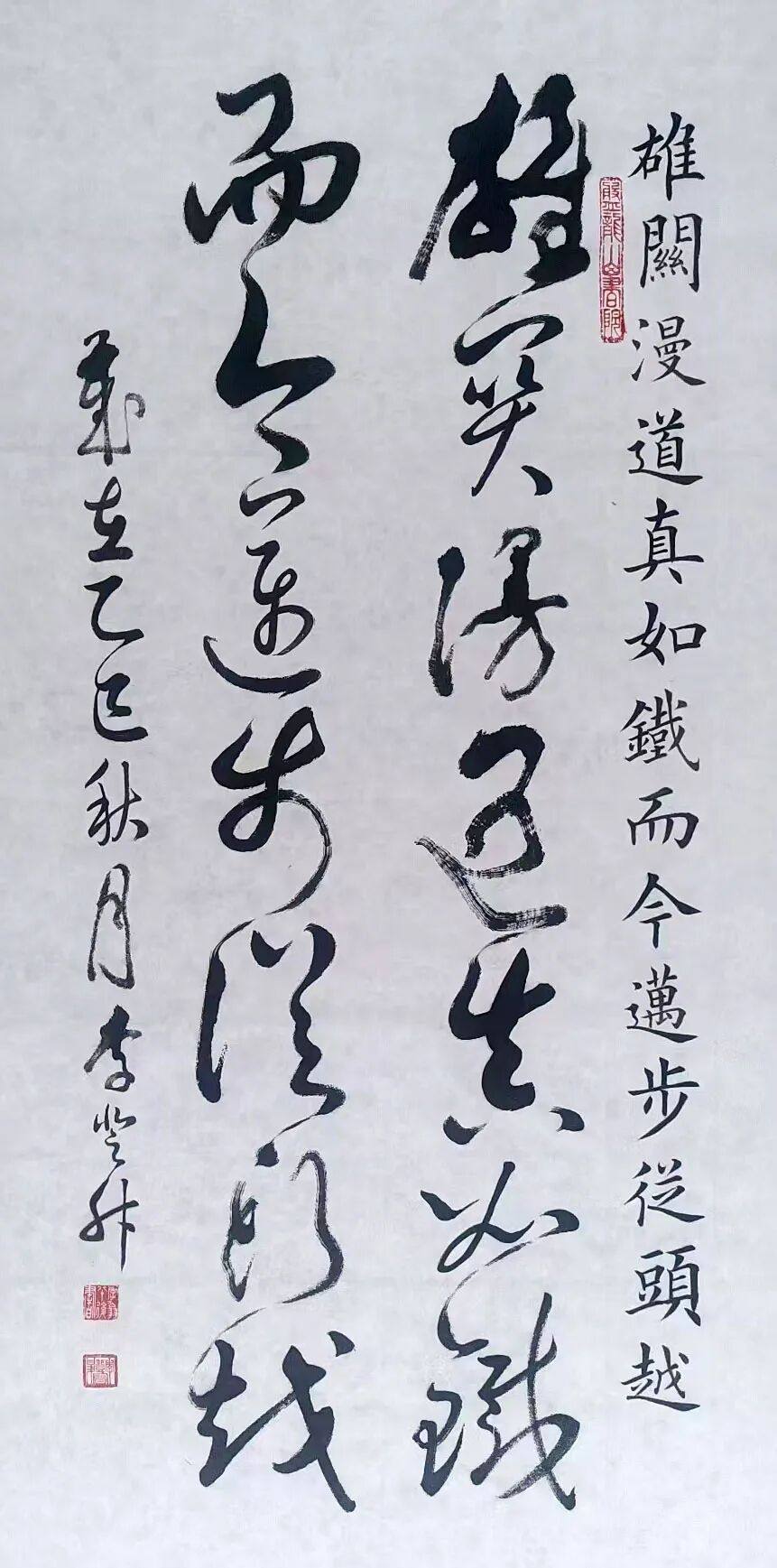 在草书造诣上,李登升先生则是尤以一种丰富的自由逸气贯彻全篇,并且这一感觉无论是在笔墨的表现上,还是在形神的塑造上,其都是有致于一体,观之是谓尽览无遗!首从笔墨技法上来看,先生笔墨虽是与传统的取法路径无异,但是整体的内在韵味却是与平常书家有着鲜明的区别,通幅笔法既能在巧拙间变化多端,也是能在灵动中赋予畅然,是感起笔之大气,也感落笔之豪迈,再加上墨韵的相辅相成,通幅草书即是更有彰显于大家气概!上下牵连映带,左右对应毕现,宏观得纵横,近观品奇绝,如此草法所行,焉能不高乎!