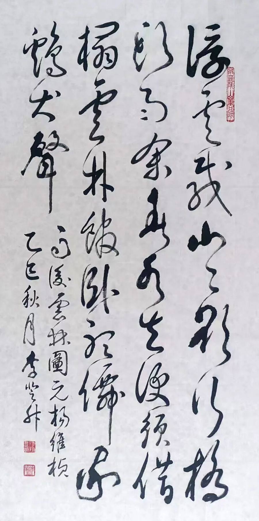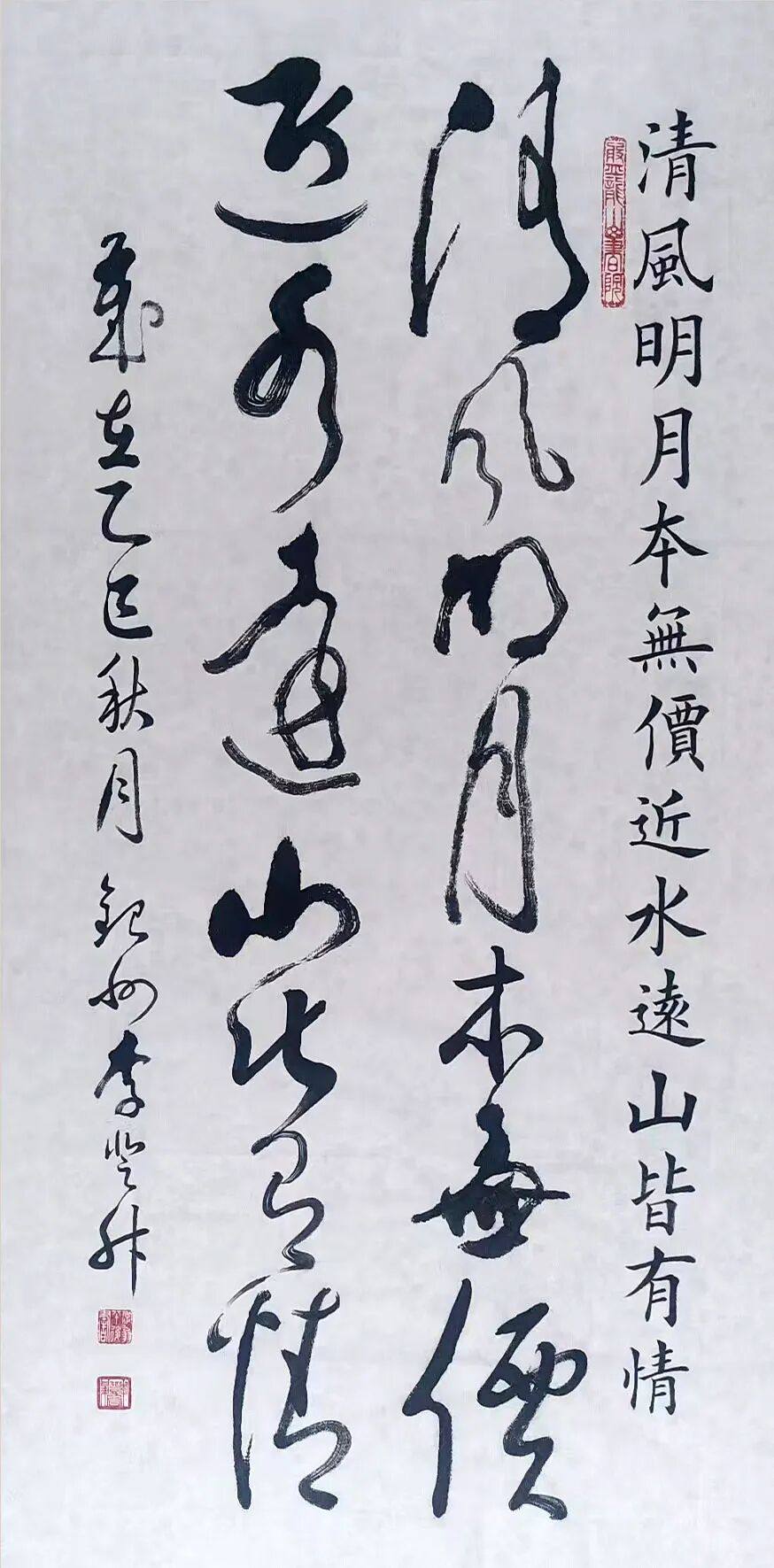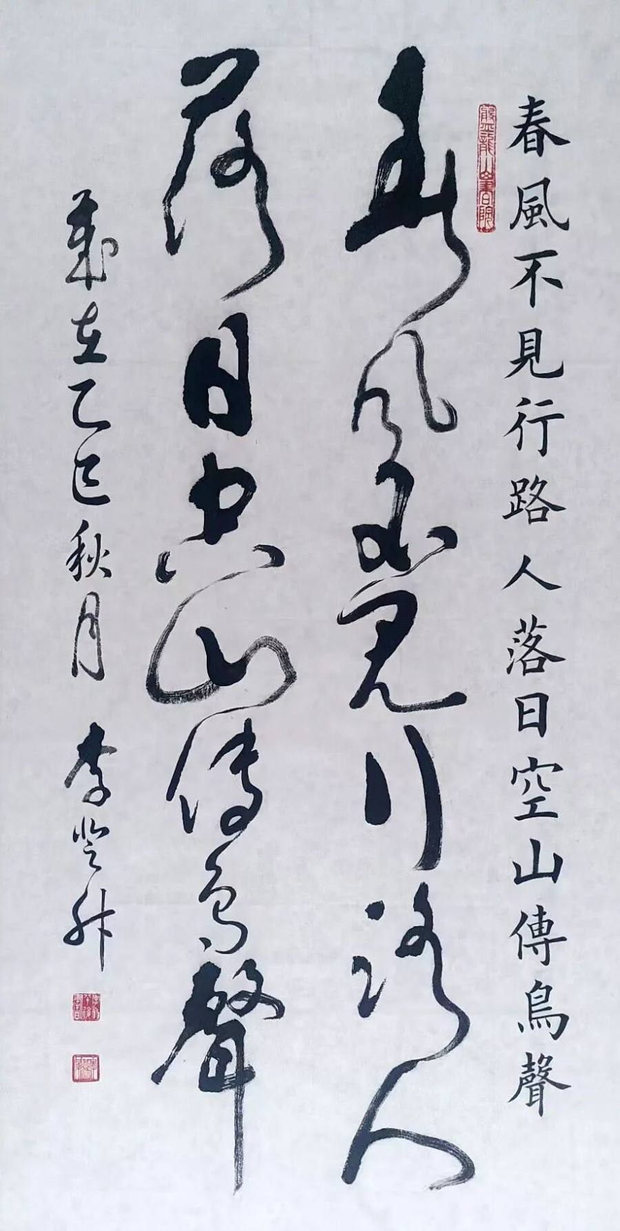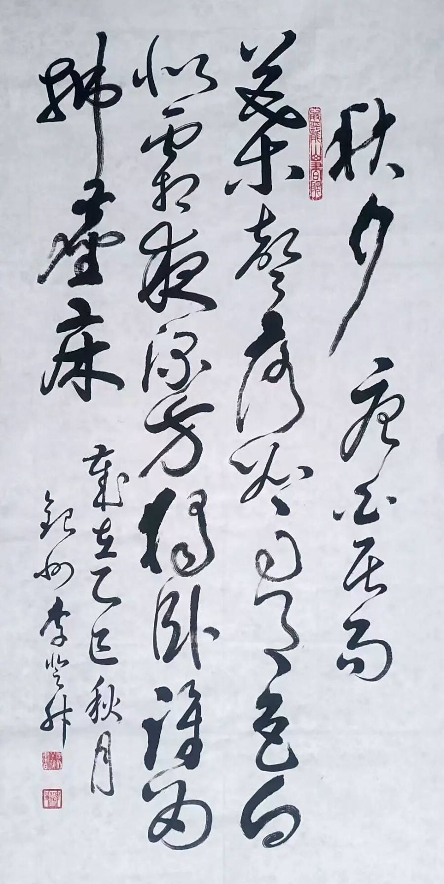 在草书造诣上,李登升先生则是尤以一种丰富的自由逸气贯彻全篇,并且这一感觉无论是在笔墨的表现上,还是在形神的塑造上,其都是有致于一体,观之是谓尽览无遗!首从笔墨技法上来看,先生笔墨虽是与传统的取法路径无异,但是整体的内在韵味却是与平常书家有着鲜明的区别,通幅笔法既能在巧拙间变化多端,也是能在灵动中赋予畅然,是感起笔之大气,也感落笔之豪迈,再加上墨韵的相辅相成,通幅草书即是更有彰显于大家气概!上下牵连映带,左右对应毕现,宏观得纵横,近观品奇绝,如此草法所行,焉能不高乎!