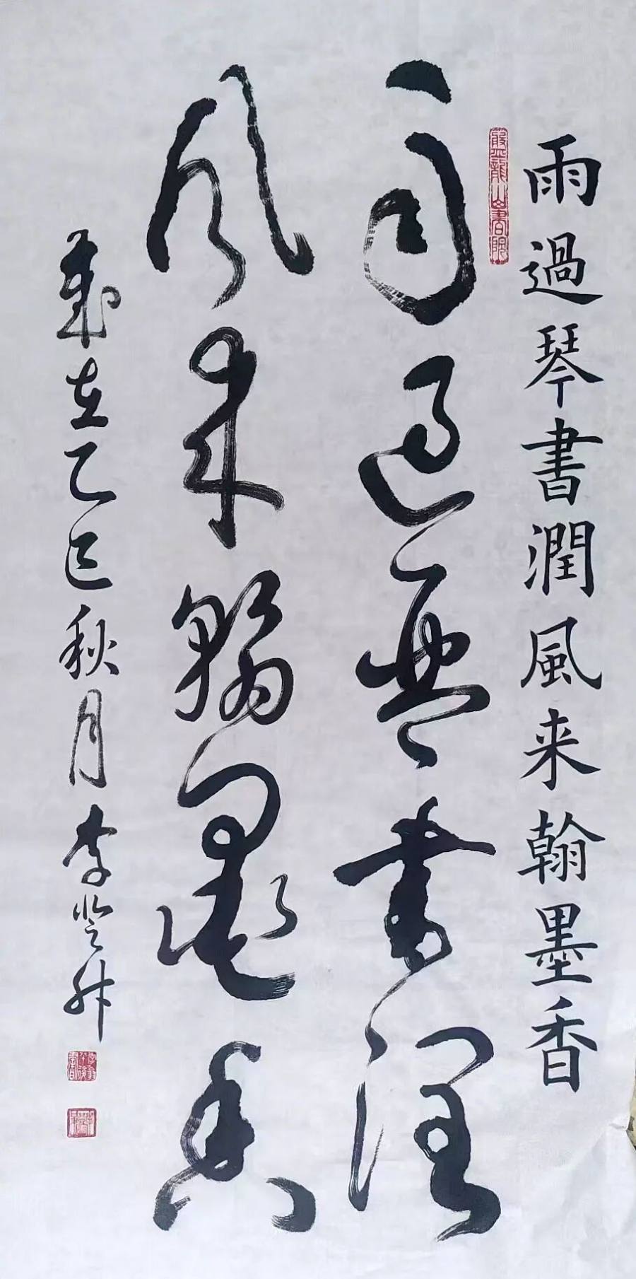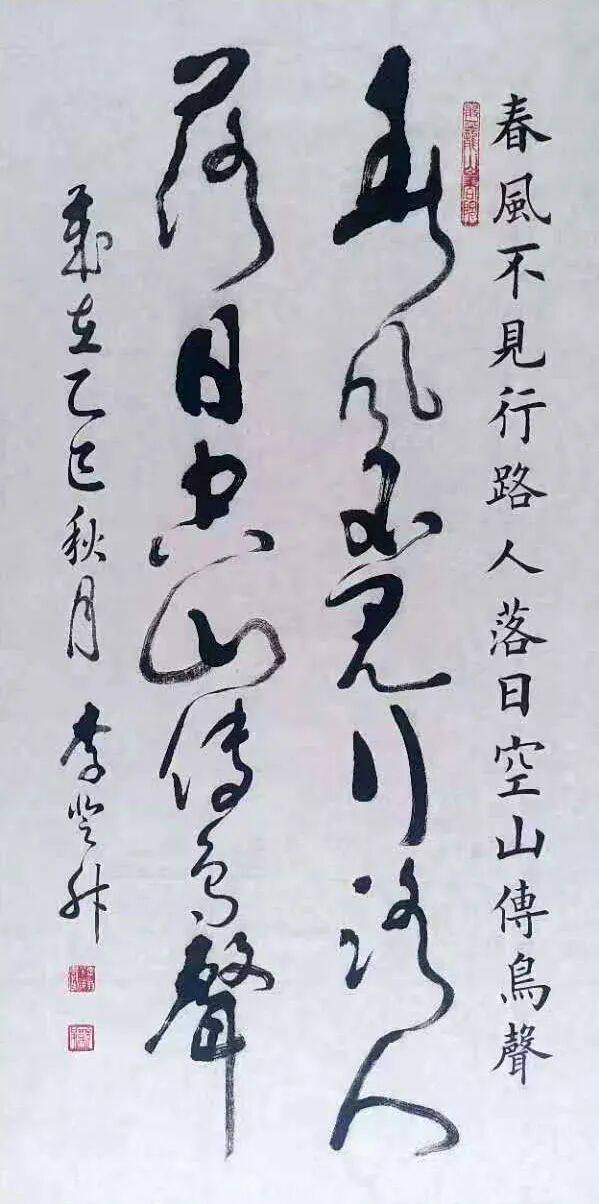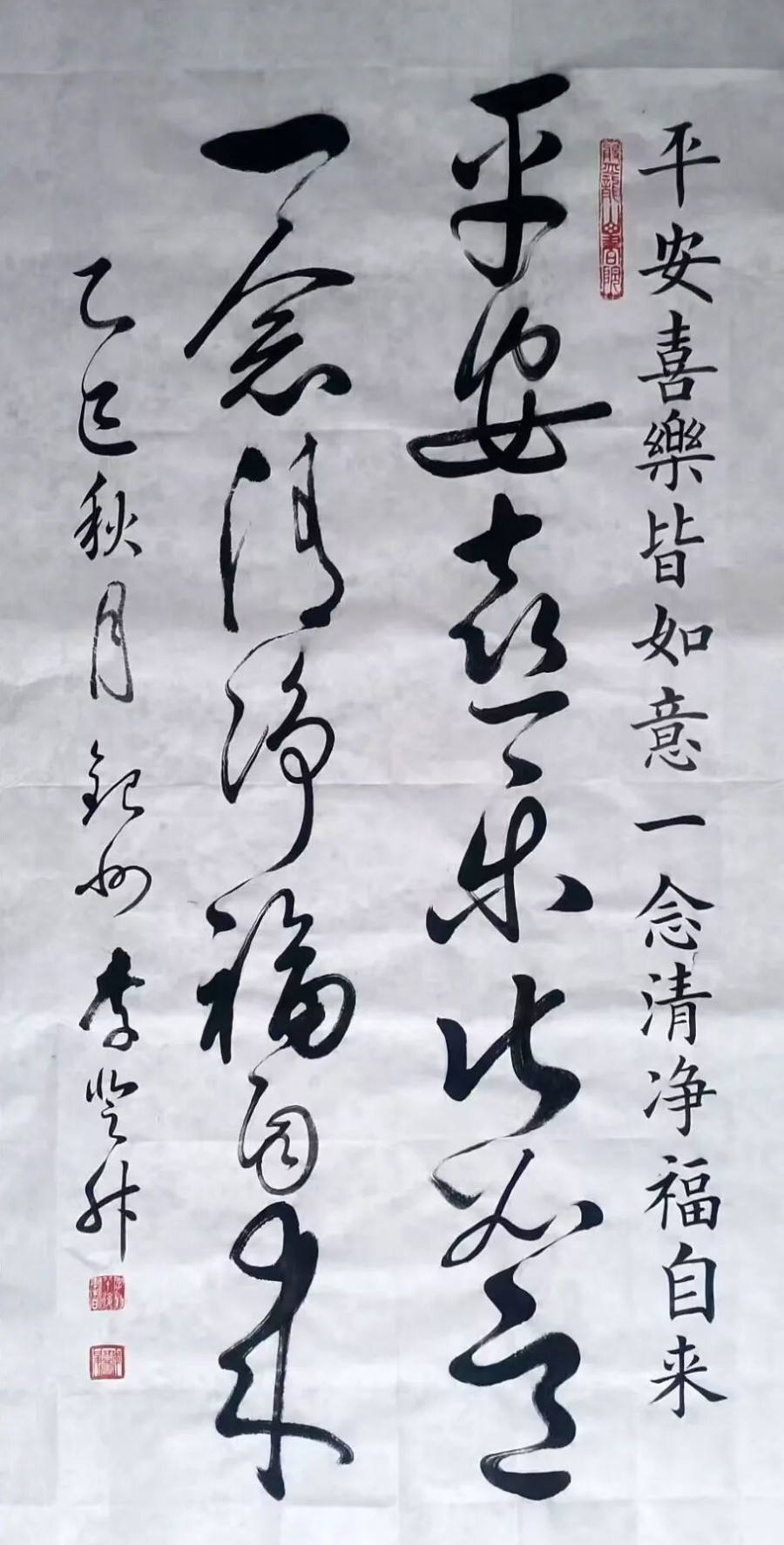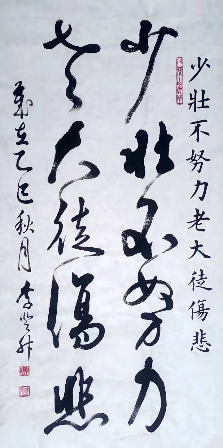 在草书造诣上,李登升先生则是尤以一种丰富的自由逸气贯彻全篇,并且这一感觉无论是在笔墨的表现上,还是在形神的塑造上,其都是有致于一体,观之是谓尽览无遗!首从笔墨技法上来看,先生笔墨虽是与传统的取法路径无异,但是整体的内在韵味却是与平常书家有着鲜明的区别,通幅笔法既能在巧拙间变化多端,也是能在灵动中赋予畅然,是感起笔之大气,也感落笔之豪迈,再加上墨韵的相辅相成,通幅草书即是更有彰显于大家气概!上下牵连映带,左右对应毕现,宏观得纵横,近观品奇绝,如此草法所行,焉能不高乎!