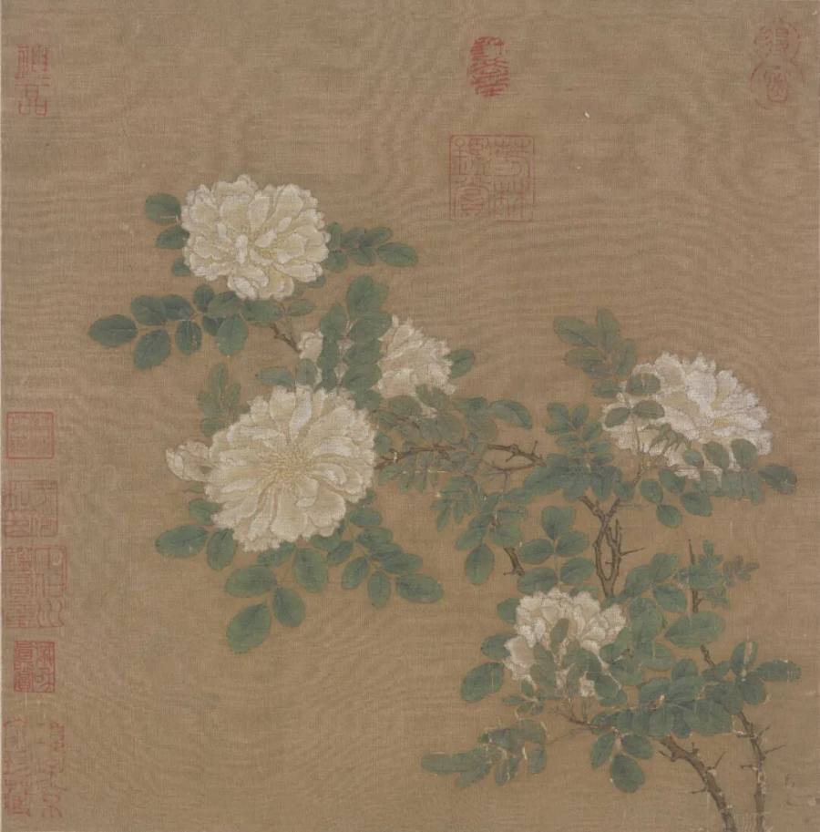 绢地温润,光含秋水。马远以小毫运笔,先定枝骨,复以白粉推染,层层相依,如云堆雪堆。叶取汁绿,或深或浅,锯齿毕现;枝呈赭褐,皮理微起,刺影斜排。花心细点若金屑,微黄从内而生;瓣缘轻提,光晕环绕。四隅朱玺错落,红对白相映,气象澄明。