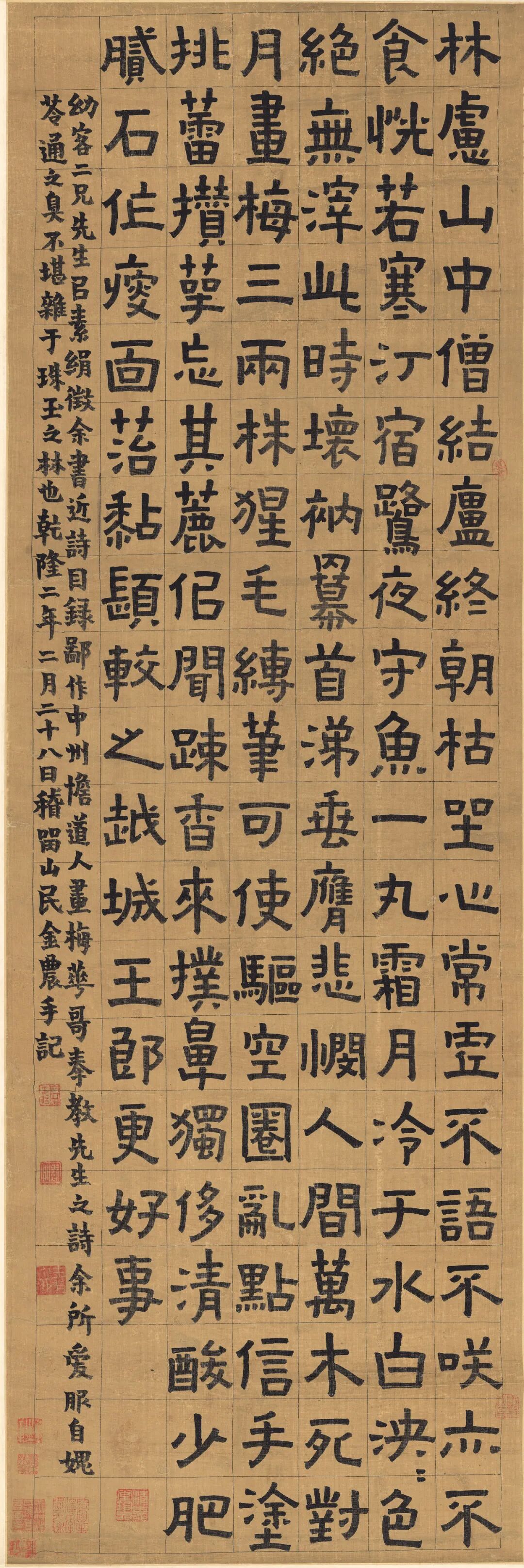 绢素方田,列行如阵。金农运腕,取隶为宗,纳碑入骨。横短而昂,竖长而劲;撇厚如斧,捺短若钉。起处方切,行处徐挫,收处疾牵;干湿互转,黑白相生。墨华沉稳,气息充盈,肌理粗粝,光若新漆。
