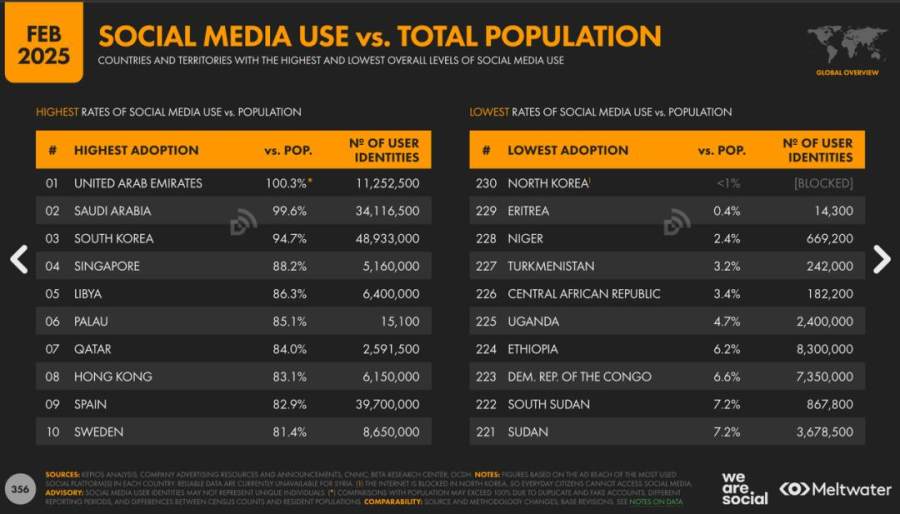 阿联酋、沙特是全球社交媒体使用率(以人口比较)最高的两个国家