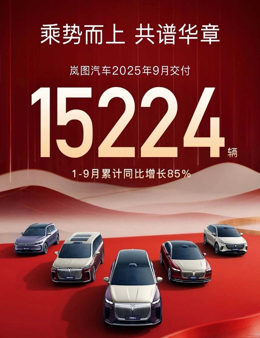 今年前三季度,岚图已累计交付96992辆,同比大增85%,其中9月单月交付达到15224辆,连续七个月销量过万并实现“八连涨”。