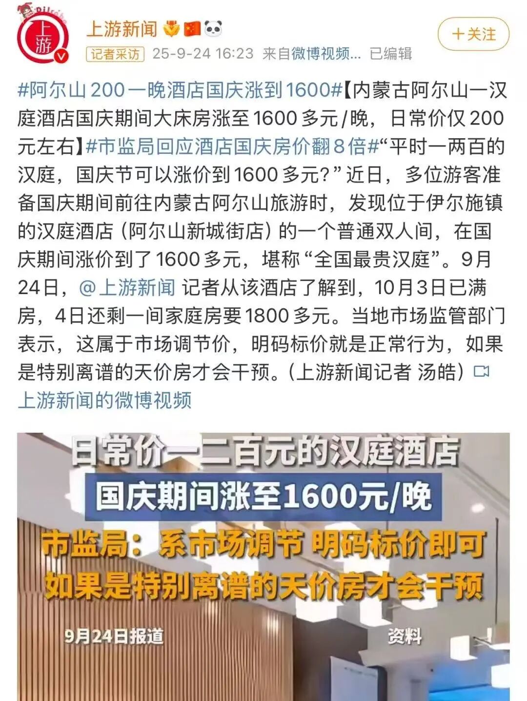 据澎湃新闻、上游新闻等国内媒体统计,在国庆假期前,很多酒店都开始猛涨房价,平时一两百的房甚至涨到一两千,十倍的涨。内蒙古阿尔山——汉庭酒店平时房价200元一晚,国庆期间大床房涨至1600多元/晚,比平翻了8倍。而据上游新闻从该酒店了解到,10月3日房已满,4日的家庭房更是要到1800多元。