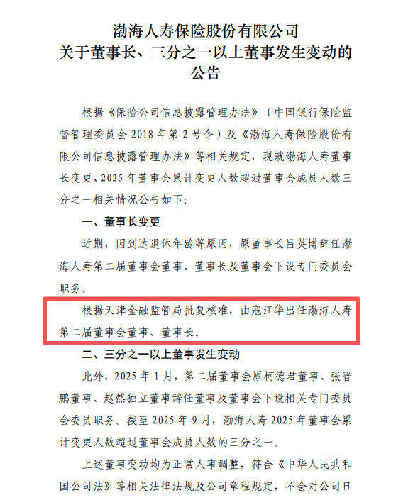 渤海人寿公告称,因到达退休年龄等原因,原董事长吕英博辞任公司第二届董事会董事、董事长及董事会下设专门委员会职务。同时,根据监管批复核准,寇江华出任渤海人寿第二届董事会董事、董事长。