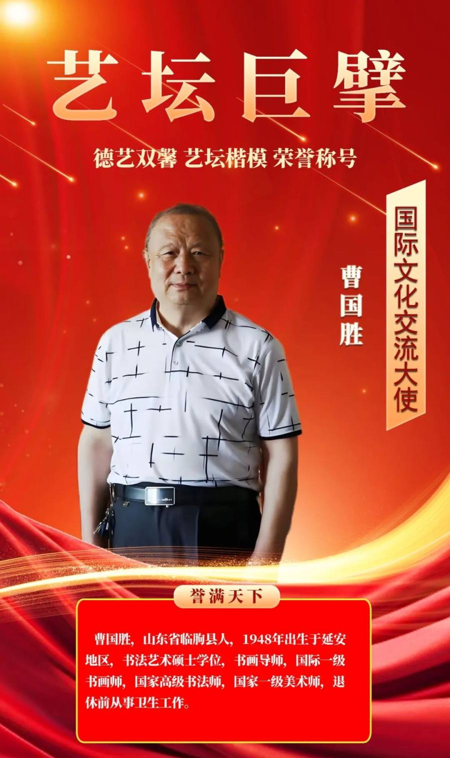 曹国胜,山东省临朐县人,1948年出生于延安地区,书法艺术硕士学位,书画导师,国际一级书画师,国家高级书法师,国家一级美术师,退休前从事卫生工作。
