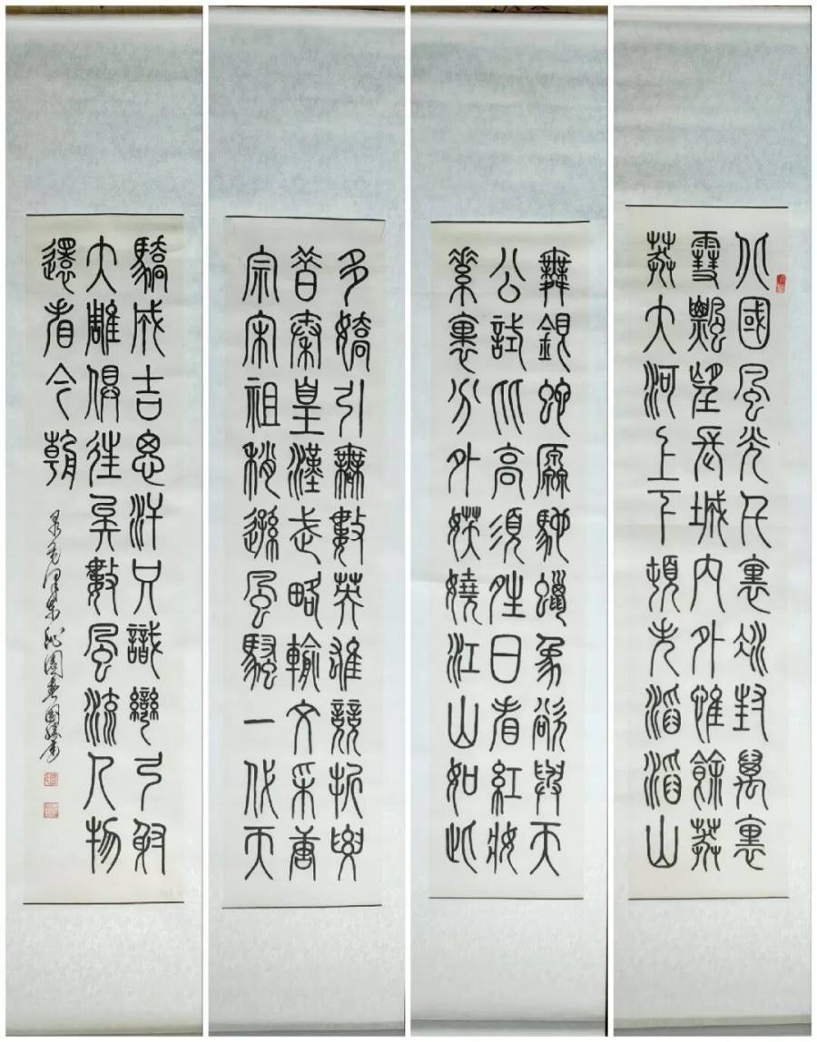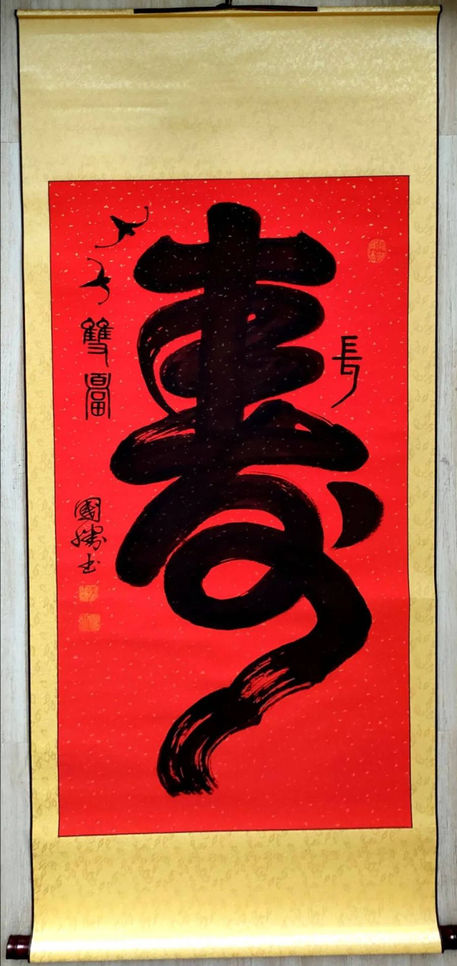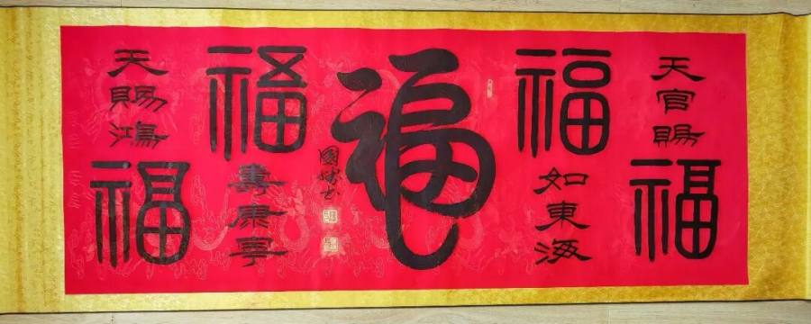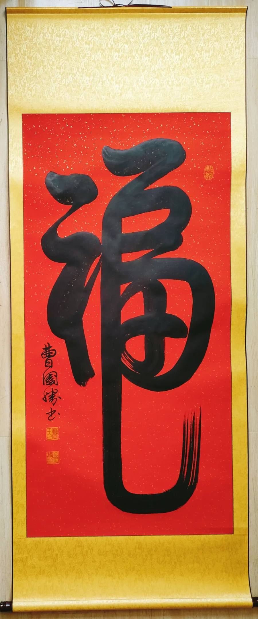 观曹国胜先生的书法艺术,堪称当代书坛的一座丰碑。观其"大福"、"大寿"等代表作,笔力雄健如擎天立柱,结体严谨若庙堂之器,将汉字的造型美感与精神内涵推向极致。在他的笔下,一点一画皆源自传统法度,却又饱含时代精神;一字一句既见颜筋柳骨之坚实,又显二王风流之韵致。而他的篆书则展现出另一种境界,取法高古而不泥古,线条圆劲如玉箸,结构端庄若庙堂,在均衡对称中暗藏机巧,既保持了金石文字的庄严感,又赋予其温润如玉的文人气息。这种将传统精髓与个人气质完美融合的书写境界,正是其数十年如一日潜心墨池的必然成果,更是其对中华书法精神本质的深刻把握。