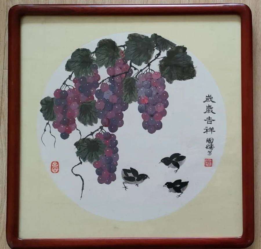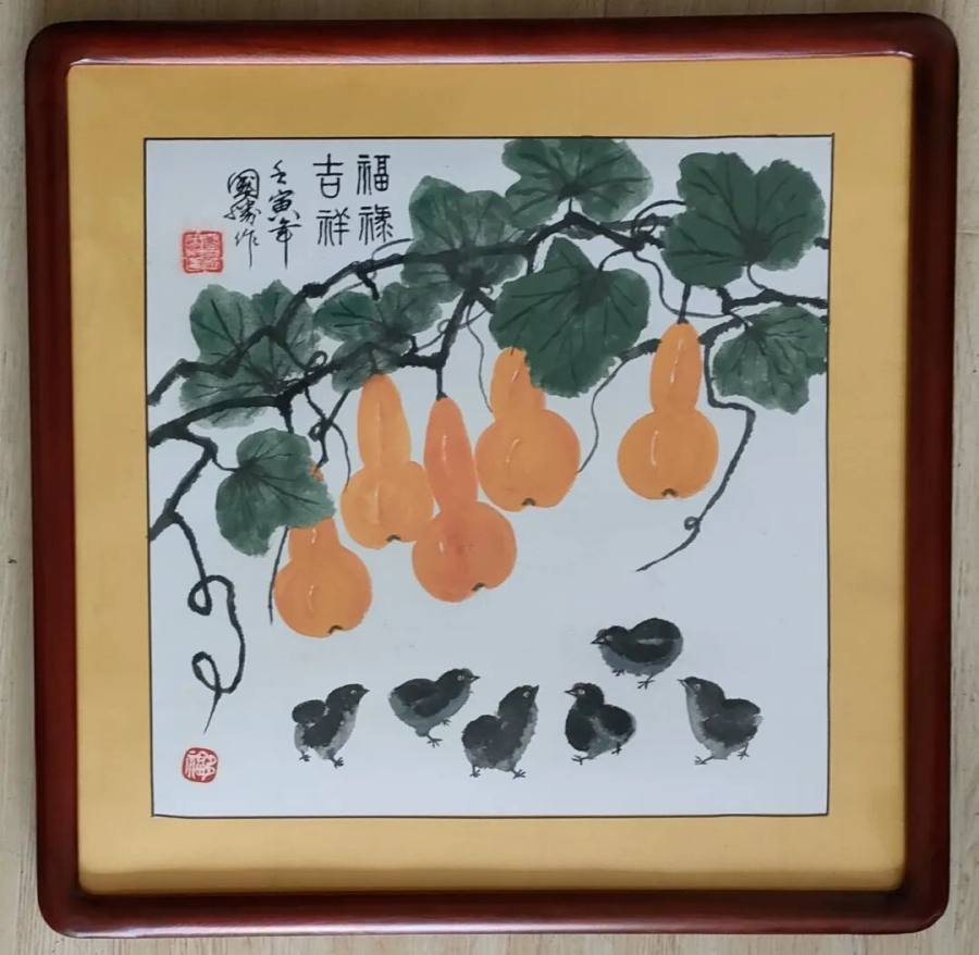 在绘画创作上,曹国胜先生善于将吉祥寓意与生活情趣熔于一炉,创造出雅俗共赏的动人意境。观其作品《岁岁吉祥》描绘了成熟的紫葡藤下,几只雏鸡悠然觅食的场景。画面中,累累葡萄紫气莹润,以精妙的色彩层次表现出饱满晶莹的质感,仿佛凝聚着天地精华。藤蔓盘绕,枝叶纷披,构成一幅丰饶的图景。尤为点睛的是画面下方稚态可掬的小鸡,它们为静谧的秋景注入了蓬勃的生机与温情,使得“岁岁吉祥”的美好祝愿,在硕果与新生生命的呼应中,变得具体而感人。另一幅佳作《福禄吉祥》则通过金葫悬垂、藤蔓萦绕的构图,辅以稚趣小鸡,传递出福禄绵长的美好祝愿。两幅作品均以物寄情,在传统吉祥题材中注入鲜活的生活气息,展现了先生对自然万物的细致观察与深厚的人文关怀。
