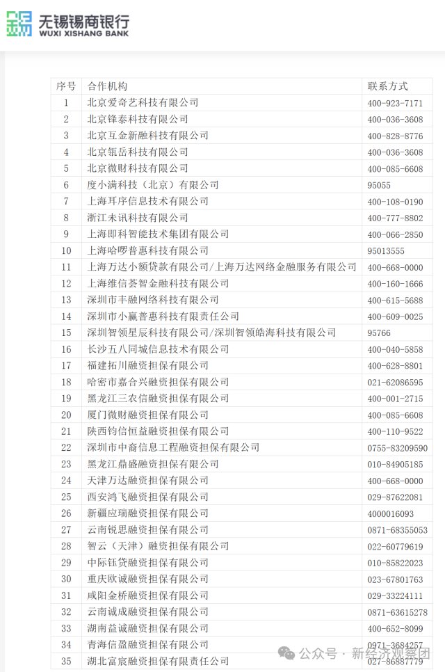 查询可知,江苏江南农商行公布了15家合作助贷机构,其中不乏极融、维信金科、分期乐等知名平台,另外还包括7家融资担保机构。