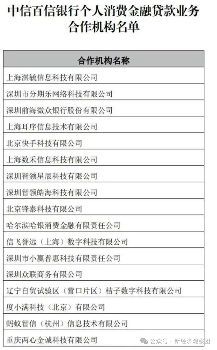中信百信银行:产业金融38家、消费贷56家,共94家合作方