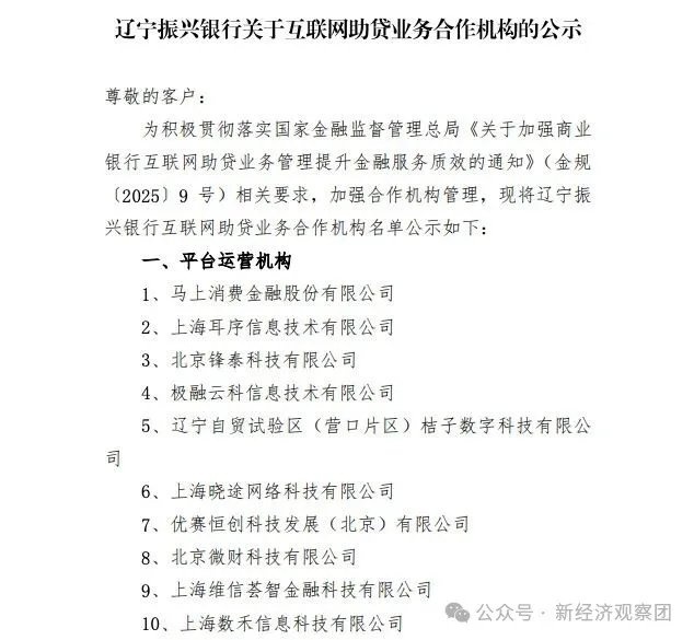 辽宁振兴银行公布了28家互联网助贷业务合作机构,其中包含10家平台运营机构,以及18家增信服务机构。其最新公布的合作机构相较于新规实施前明显减少,部分高定价的平台已被排除在外。