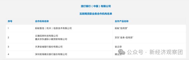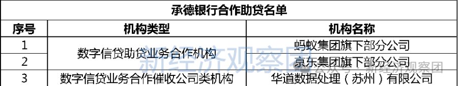 承德银行的助贷合作名单是目前已公布信息中最为简单的一家,仅选择了蚂蚁和京东两家巨头,以及催收机构华道数据。