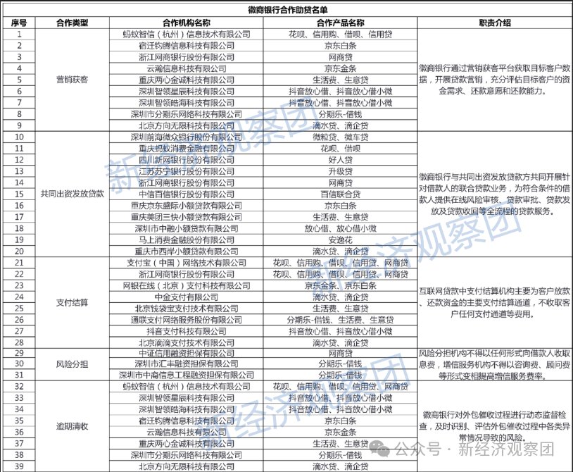 相对而言,徽商银行披露的信息则比较详细,既有合作机构名单,还覆盖了对应产品,以及徽商银行职责内容。合作机构共有39家,分为营销获客机构、联合贷合作机构、支付机构、融担机构和催收机构,囊括了市场上互联网大厂平台、主流助贷平台以及头部民营银行。