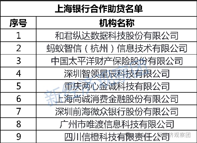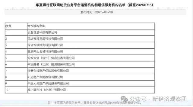 华夏银行公布了10家互联网助贷业务平台运营机构和增信服务机构名单,包括蚂蚁、百度等互联网大厂,以及阳光财险、大地财险等保险公司。