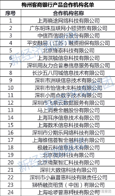 梅州客商银行也在日前发布合作机构名单,包括24家合作获客机构。其中,既有百信银行、马上消金等持牌机构;还有五八同城、哈啰等流量平台,需要指出的是,与此前金融机构相比,作为尾部民营银行的梅州客商银行,合作的头部助贷平台较少,以中部机构为主。