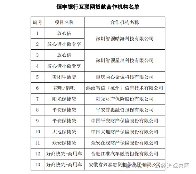 恒丰银行在官网披露了互联网助贷业务中平台运营机构、增信服务机构名单,共计13家,包含大厂系平台、保险类平台和融担系平台三类。