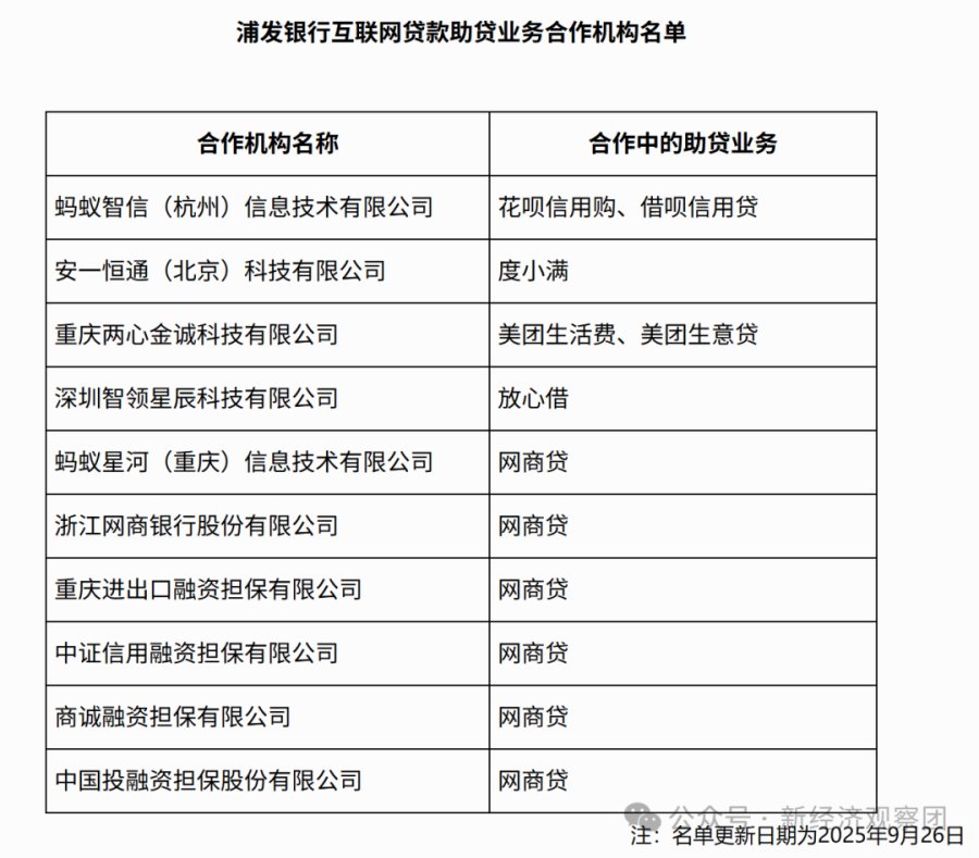 在披露的合作机构名单中,浦发银行的合作方主要是蚂蚁、度小满、美团、字节等头部机构,以及与网商银行、多家担保公司合作的网商贷产品。