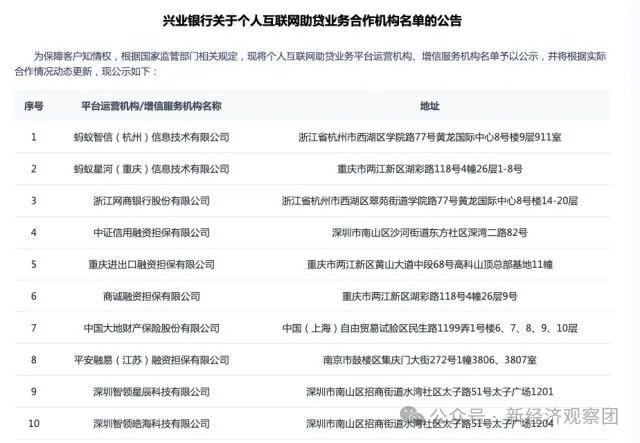 兴业银行公布了10家互联网助贷业务合作机构名单,其中既有蚂蚁旗下多家机构,还有保险公司贷款产品,比如中国大地财产保险股份有限公司等。
