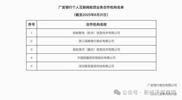 广发银行互联网助贷业务合作机构较少,根据官方披露信息,只有5家,分别是蚂蚁智信(杭州)信息技术有限公司、浙江网商银行股份有限公司、蚂蚁星河(重庆)信息技术有限公司、中国投融资担保股份有限公司和深圳智领星辰科技有限公司。