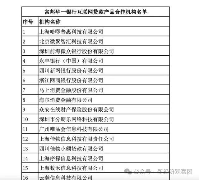 在目前维持的51家合作机构中,机构类型十分多元化。有类似上海哈啰普惠科技有限公司、北京微聚智汇科技有限公司(微博借钱)、深圳智领星辰科技有限公司(抖音)等流量平台,还有上海淇毓信息科技有限公司(奇富科技)、深圳市分期乐网络科技有限公司(乐信)等大家耳熟能详的助贷平台。此外,另有微众银行、网商银行、新网银行等头部民营银行,外资行永丰银行,以及马上消费金融、海尔消费金融等,均在富邦华一银行的合作名单之列。