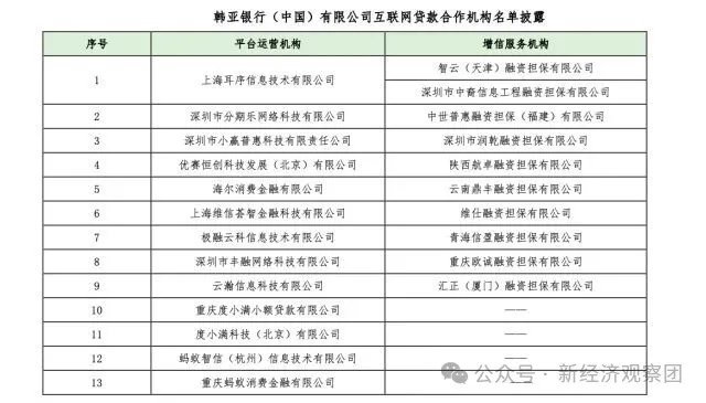 韩亚银行(中国):13家平台运营机构+10家增信服务机构,共计23家合作机构