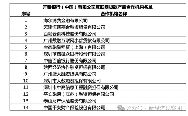 开泰银行(中国)在8月26日公布了14家互联网贷款产品合作机构名单。包括前海微众银行等头部民营银行,还有平台运营机构、增信服务机构,以及中国平安财险、泰山财险等保险公司,海尔消费金融等消金公司等。