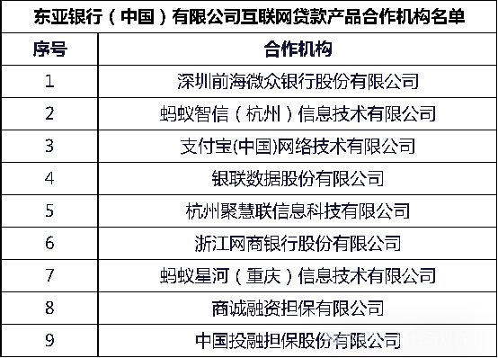 9月10日,东亚银行(中国)官宣了9家助贷机构,并表示将不定期更新名单。