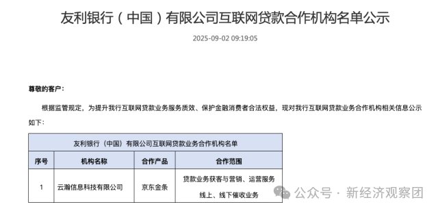 友利银行(中国)合作机构是几家外资银行中最少的一家,目前该行仅与云瀚信息科技有限公司一家公司展开互联网贷款业务合作,涉及京东金条产品,涵盖贷款业务获客与营销、运营服务及催收业务。