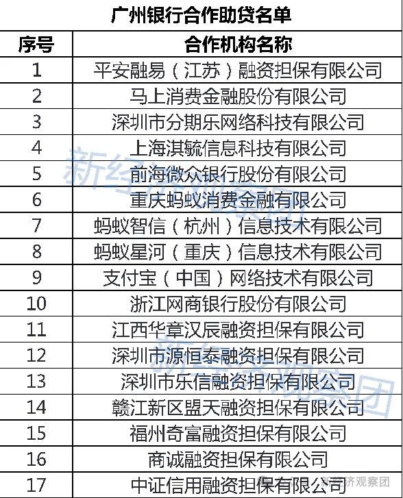 在广州银行最新公布的17家互联网贷款业务合作机构名单中,覆盖蚂蚁、奇富科技等6家头部助贷平台,也包含乐信融担、奇富融担等7家融资担保公司,以及微众银行、网商银行等持牌金融机构。