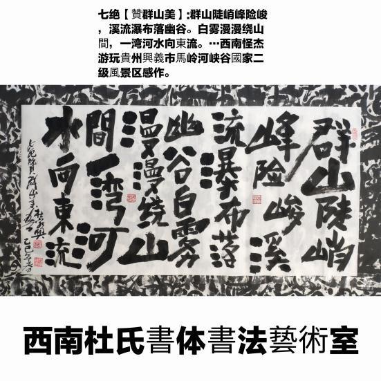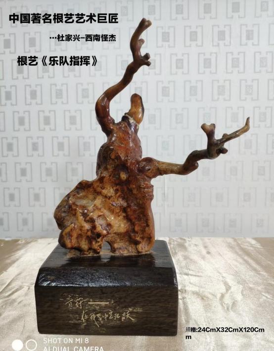 杜家兴,号:西南怪杰,贵州省黔西南州兴义市人士。中国著名根艺艺术巨匠,中国艺术名家,中国著名书法名家,国礼艺术名家,中央电视台 CCTV《艺术名家》特聘艺术顾问,北京-新加坡《中华文化艺术之旅交流大使》。自小酷爱文学,诗词,书法,摄影。并于 2018 年 8 月 8日成立了《贵州天星盘江根奇石艺术馆》,《西南杜氏书体书法艺术室》,《西南摄影艺术摄影艺术室》。书法艺术室三类书法体:一类直线形自创书体,《注:首创于 2020 年春》,二类行书体,三类草书体。并在 2021 年“九州诗词杯”全国诗词大赛荣获优秀奖,2022 年文韵传承《中国现代名家书画大赛》荣获书法二等奖,2023年“新春墨韵杯”全国书画艺术大赛荣获书法一等奖,2023 年第 28 届全国书画家“兰亭杯”书画大赛荣获书法银奖,2023 年荣获“诸子百家杯”全国文学大赛三等奖。本艺术馆书法作品还在 2023 年有幸参加《贵州汉台酒业有限公司》“国宴国酒-艺术茅台”酒文化,书法作品荣登《艺术珍藏酒》瓶。又于 2024 年再次荣幸参加《贵州汉台酒业有限公司》举办的“艺术茅台- 祥龙呈瑞”2024 新春贺岁,书法作品再次荣登美酒瓶。还于 2024 年参加江西景德镇陶瓷艺术宣传中心主办“景瓷天下-传承国粹”活动。本馆根艺,书法作品荣登艺术陶瓷。并于 2023 年荣幸参加澳门邮政“盛世中华-复兴有您”《纪念毛泽东同志诞辰 130 周年》,根艺,书法作品荣登澳门邮票出版收藏册为两会献礼。又于 2024年本馆根艺,书法作品再次荣幸参加澳门邮政邮票出版收藏册为“建国伟业-庆祝中华人民共和国 75 周年”献礼。又再于 2025 年根艺,书法作品荣登:全球《北京-新加坡》中华文化艺术之旅活动!纪念邮册邮票出版。另外在 2024年本馆根艺,书法作品受邀走出国门…荣登大洋彼岸的美国纽约时代广场数字大屏幕及:2025 年马来西亚吉隆坡双子塔数字大屏幕展播。还于2025 年受邀代表中国艺术界出席杭州第 25 届世纪大彩风品牌人物年度盛典并发言。2025 年艺术馆作品受邀参加由新加坡政府出版《世界非遗传承人大辞典》。2025 年受邀参加“庆祝故宫博物院建院 100 周年”,根艺,书法作品荣幸登上由:比利时,德国,荷兰,日本,韩国五大国邮政集团负责印制并全球发行。2025 年受邀法国巴黎《第 36 届卢浮宫当代国际艺术博览会》及《丝路艺韵》2025 中俄艺术之旅暨圣彼得堡美术家协会特邀展…本馆书法作品荣幸参展。回顾创作各类艺术至今,虽取得了些成绩,但还应继续努力。有道是:艺无止境当奋搏,学海无涯苦作舟。天若有情天亦老,勇攀艺术险峻峰。在此万象更新,继往开来的 2025 年新世纪,让我们与时俱进,再创辉煌,展望未来,努力奋进!…馆长: 杜家兴-西南怪杰