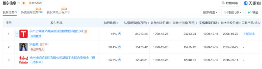 据天眼查数据显示,尽管宗庆后身为“娃哈哈”品牌的创始人兼首任董事长,但在娃哈哈集团的股权结构中,宗家仅持有29.4%的股份;而杭州市上城区文商旅投资控股集团有限公司持有46%的股份,是娃哈哈集团实际上的控股股东;剩余24.6%的股份则归属于娃哈哈集团职工持股会。