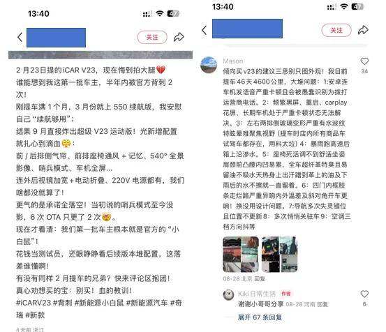 V23的一些细节设计更是劝退了不少试驾者。例如,后排空间局促,带孩子出行体验不佳;车辆解锁键位于左侧翼子板,被客户吐槽 “反人类设计”。更关键的是视野和安全性问题,方盒子车型车身较高,驾驶盲区大,倒车、停车时尤其依赖360度全景影像、雷达等辅助系统。iCAR V23虽将前激光雷达布置在前保险杠两侧,厂家称这一设计侧重高阶智驾的障碍物精准探测,但有试驾客户表示,V23的360度影像本身在车头位置就存在盲区,且外露的激光雷达一旦发生碰撞极易损坏,维修成本高昂。据DoNews报道,iCAR一线销售刘萱(化名)无奈地表示,“V23从邀约试驾到最终成交,中间流失的客户非常多。”