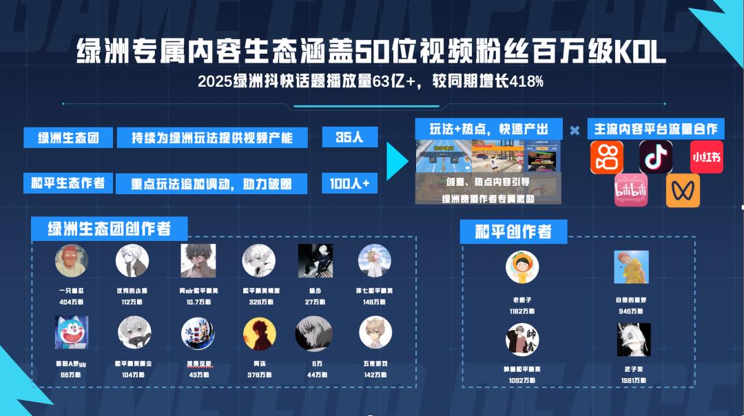 从这些热门玩法走红的案例里面我们不难发现,它们能实现从小众尝试到“全网出圈”的突破,核心正是绿洲启元搭建的端内+端外全链路曝光矩阵在发挥作用。通过端内大厅推荐、活动专题触达,让玩法快速获得初始玩家基数;再依托端外抖快话题联动、内容扶持,推动玩家自发创作衍生内容;最终借助衍生内容的二次传播,让玩法实现“爆火破圈”的整个过程,正是全链路曝光矩阵从0到1激活内容热度的具象体现。