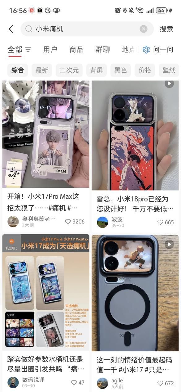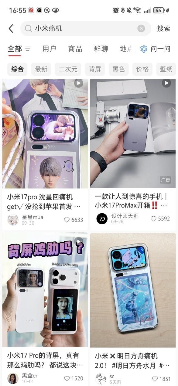几乎同时,小米17 Pro因其独特的背屏设计,在社交媒体上引爆了“二次元痛机”风潮,用户自发将其打造为个人情感的展示窗。