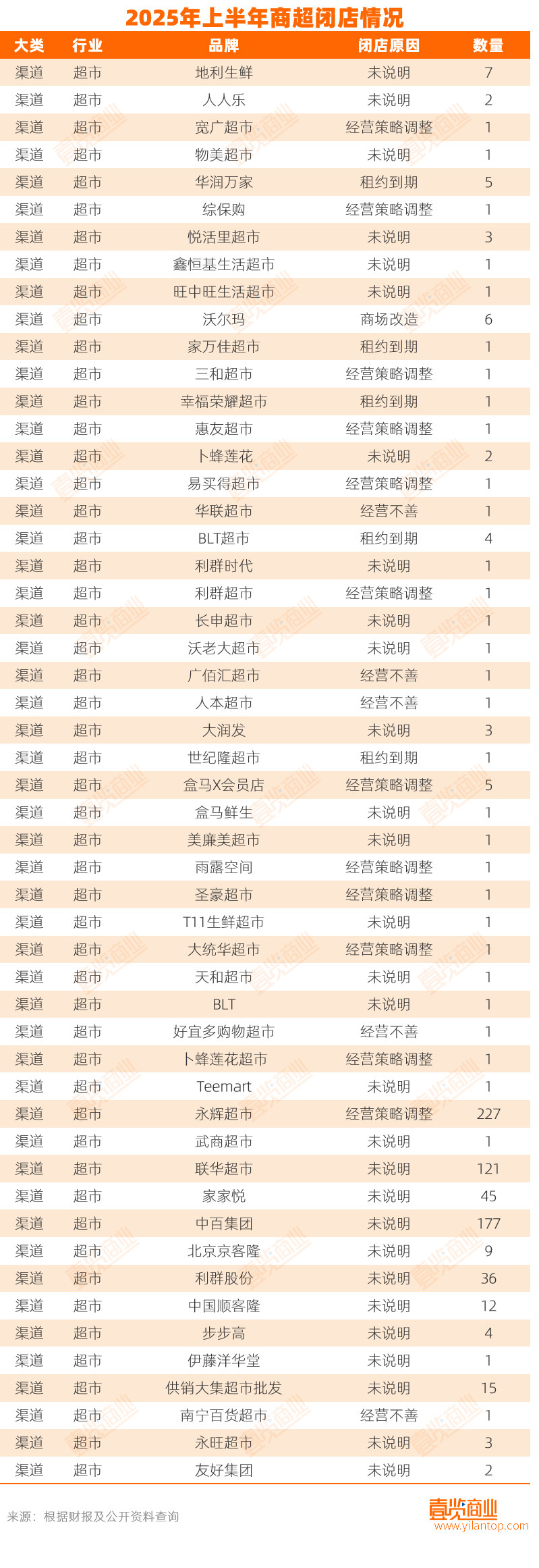 据壹览商业不完全统计,2025年上半年,全国至少有720家超市关门,既有卜蜂莲花、华润万家、永辉超市、大润发等全国乃至全球性品牌,也有地利生鲜、悦活里超市等区域性品牌。