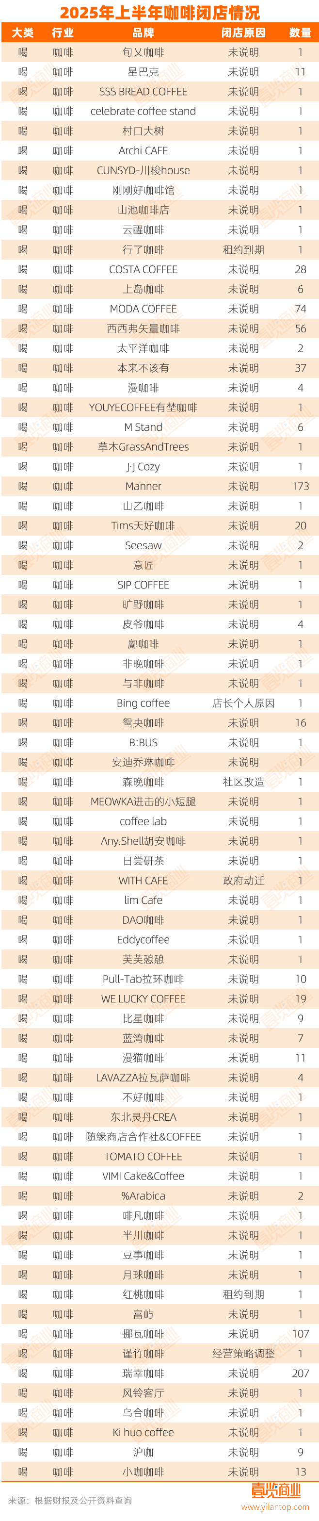 二是近年新兴的垂直/精品品牌,在追求效率与规模的市场环境下遭遇挑战。如MODA COFFEE至少关闭74家门店,茶颜悦色旗下的咖啡子品牌鸳央咖啡门店也关闭16家门店。